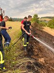 Lage: Gemeldet war der Brand einer Freifläche von ca 20m². Beim Eintreffen brannten ca. 200 m². Durch den Wind breitete sich der Brand auf ca. 1000 m² aus, konnte jedoch schnell abgelöscht. Die Fläche wurde gewässert, teils umgegraben und mit der WBK kontrolliert.